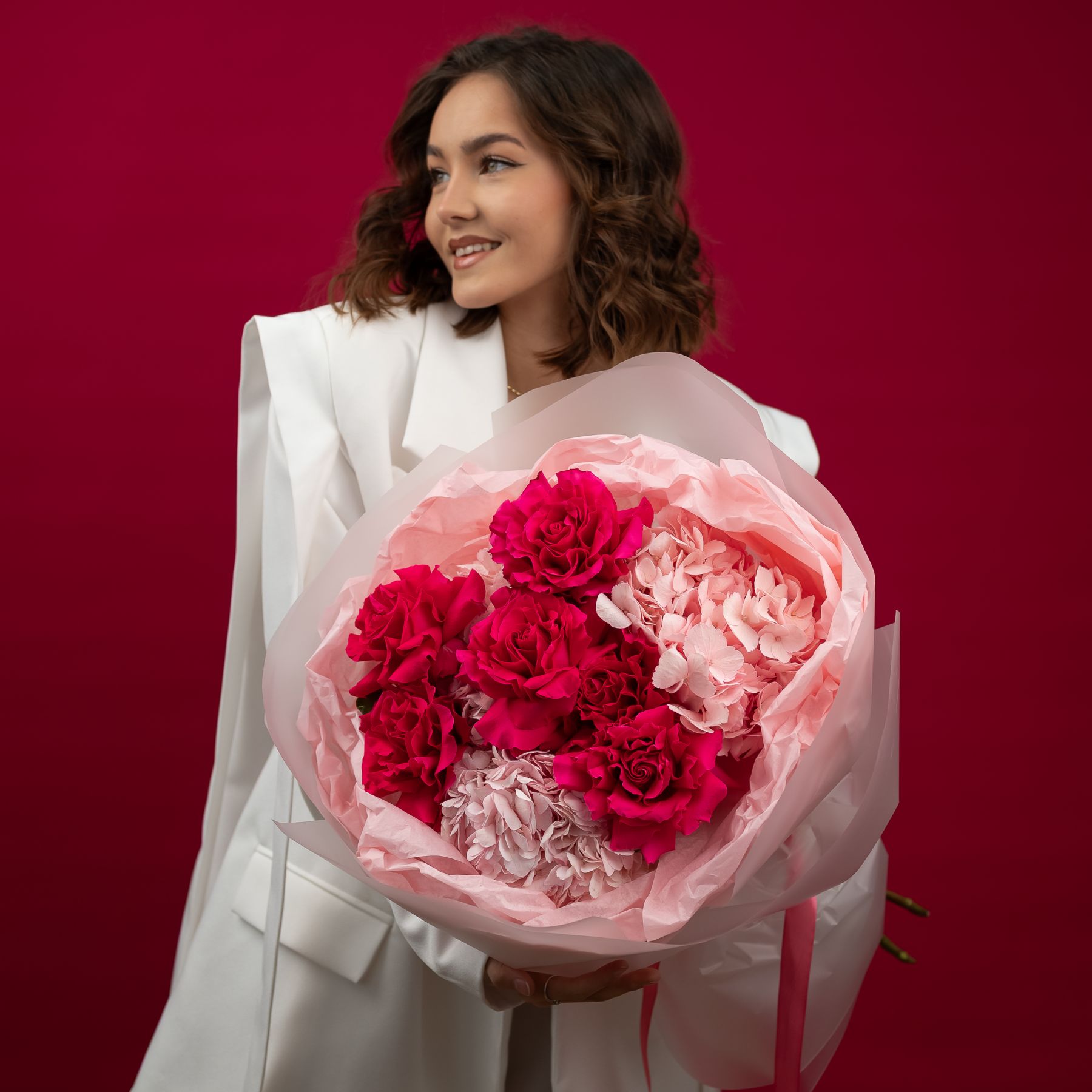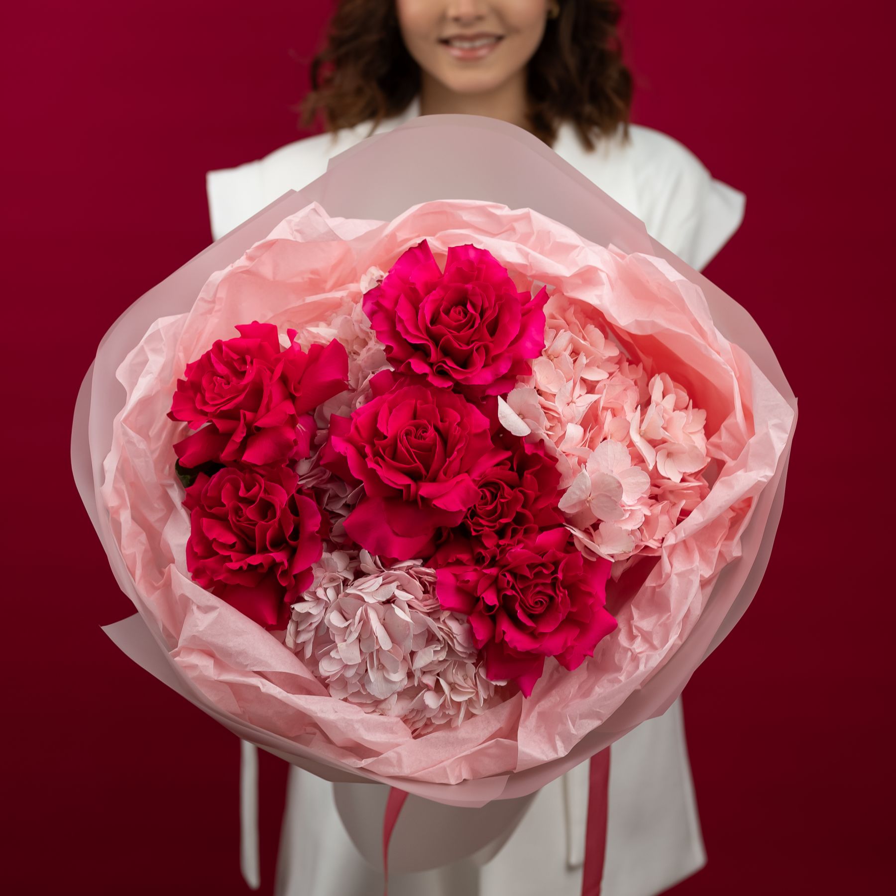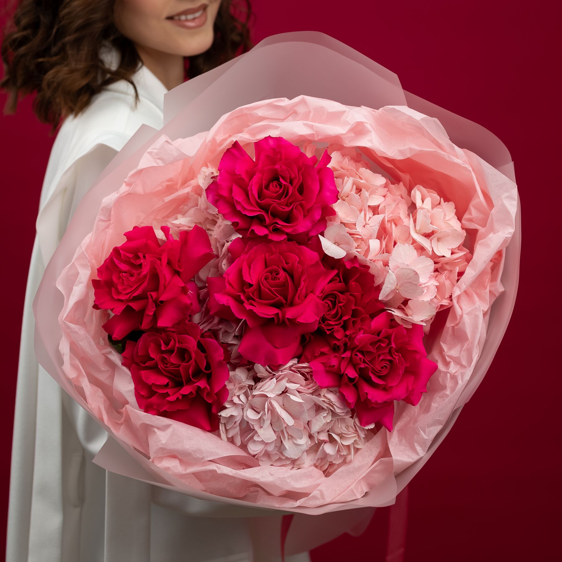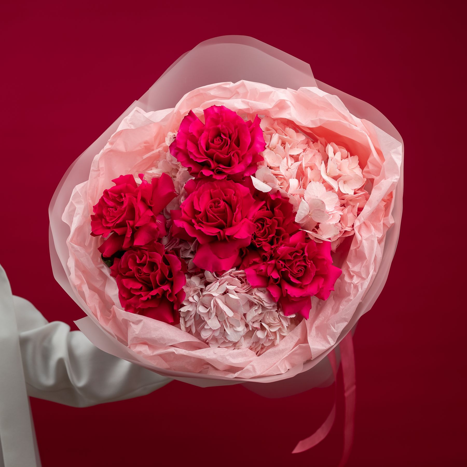 Состав: гортензия - 3 шт французская розовая роза - 6 шт упаковка - 1 шт